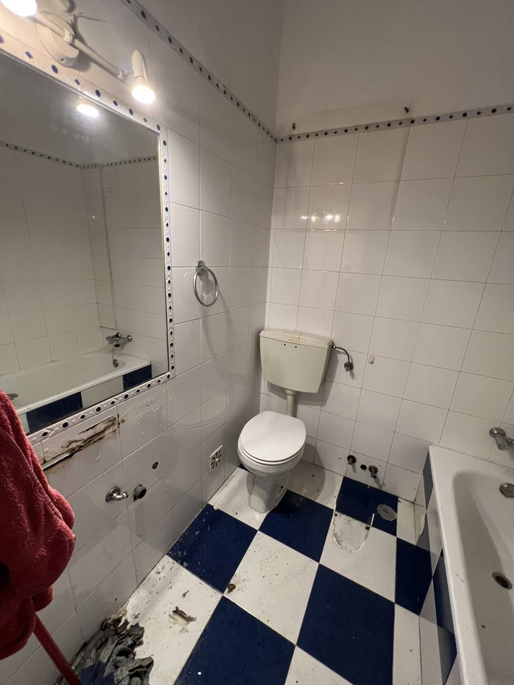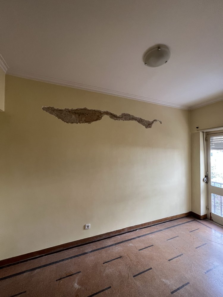 Reabilitação completa de um apartamento em Benfica que apresentava sinais evidentes de degradação, incluindo infiltrações nas paredes e acabamentos datados. A intervenção começou com a demolição integral da cozinha e casa de banho existentes, bem como a remoção de todos os revestimentos. As paredes foram tratadas e impermeabilizadas para eliminar os problemas de humidade. A nova cozinha apresenta armários brancos com bancada clara e electrodomésticos integrados, num layout funcional e luminoso. A casa de banho foi redesenhada com revestimentos em tons de cinza, louças modernas e espelho com iluminação. Os quartos receberam nova pintura em tons neutros e acolhedores, enquanto a zona de refeições foi renovada com pavimento em madeira. O resultado é um apartamento completamente transformado, moderno e pronto a habitar.