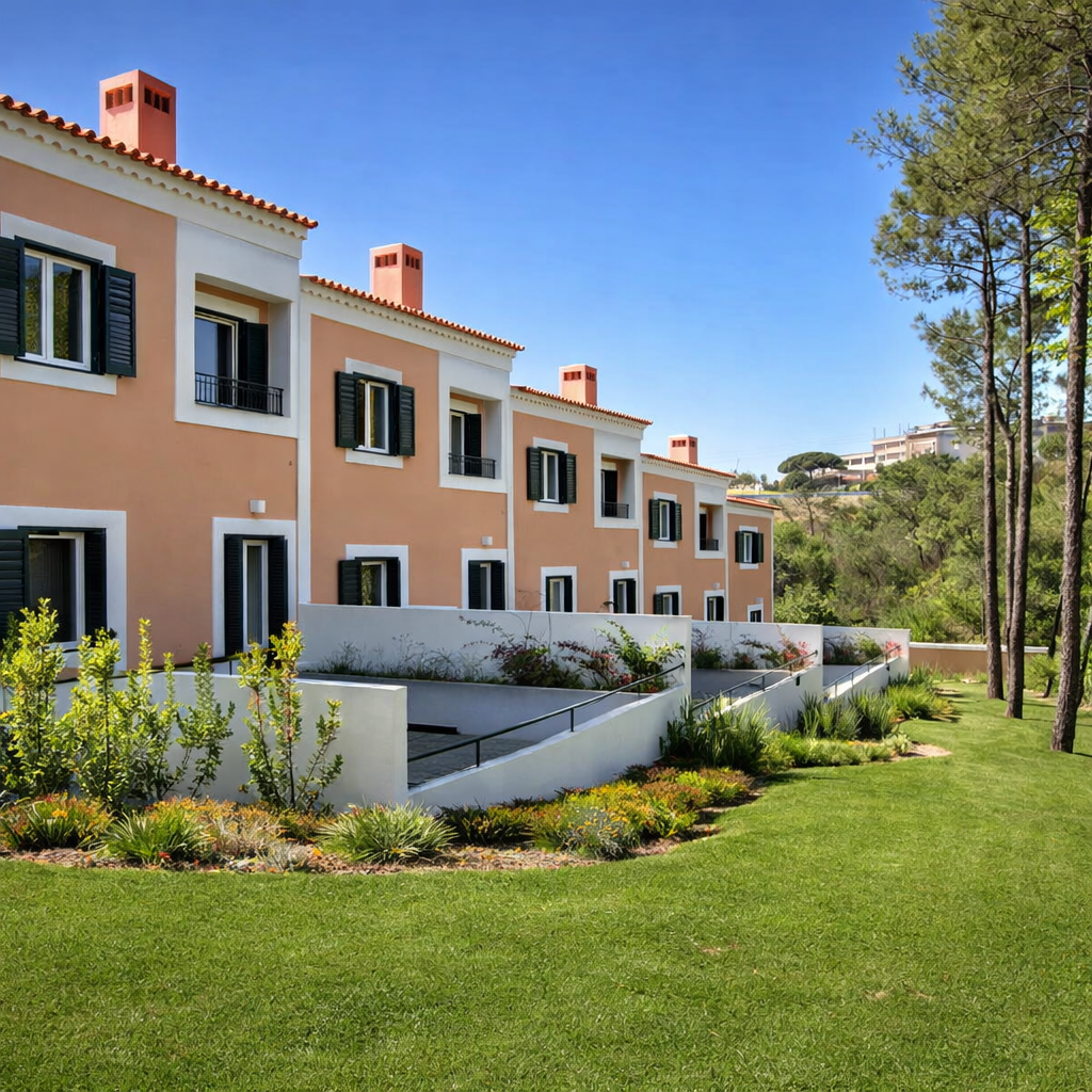 Condomínio residencial no Guincho com piscina orgânica, moradias modernas e interiores contemporâneos.