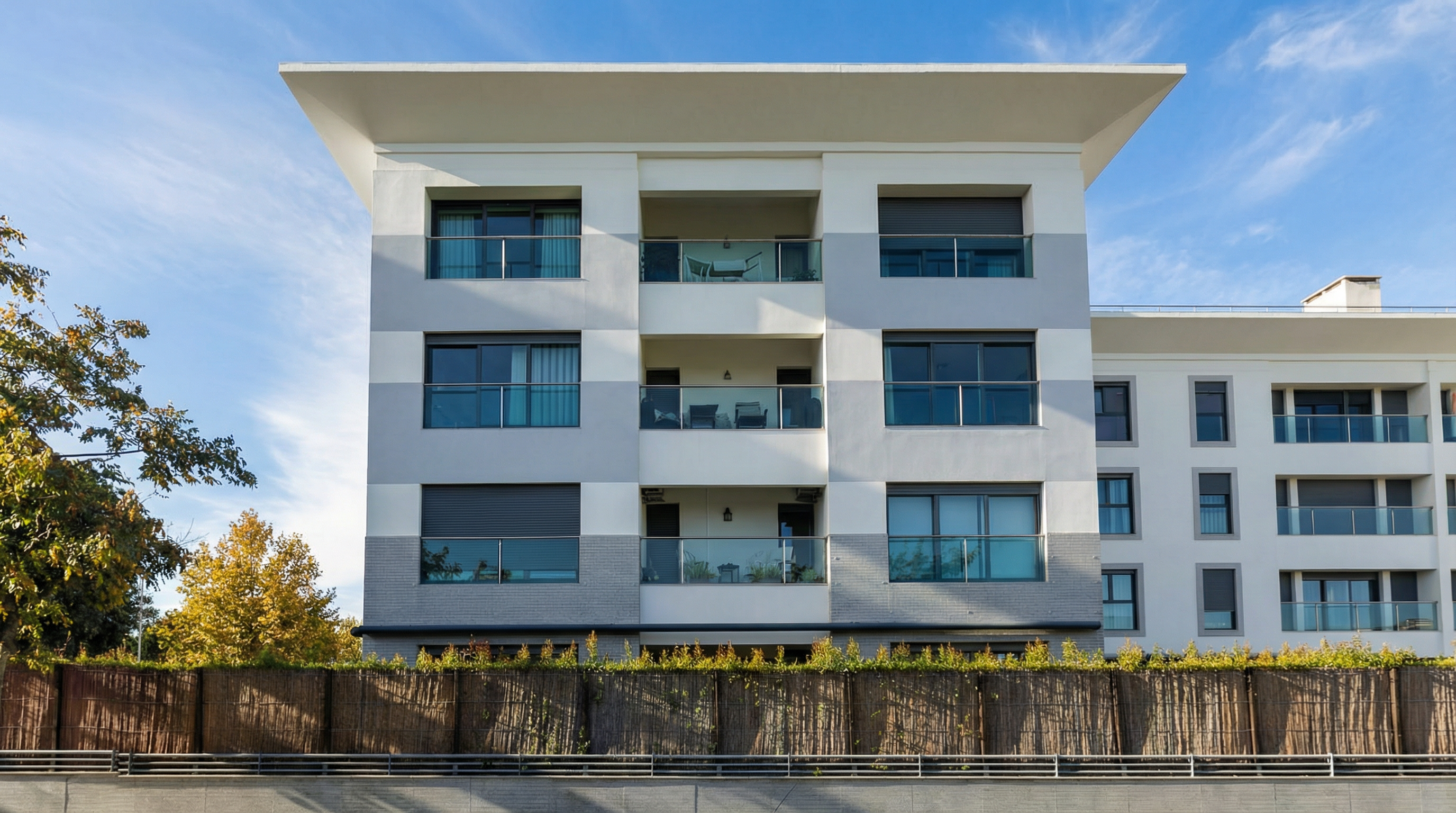 Edifício residencial de luxo no Estoril com fachada em azulejo dourado, e apartamentos de dimensão generosa.