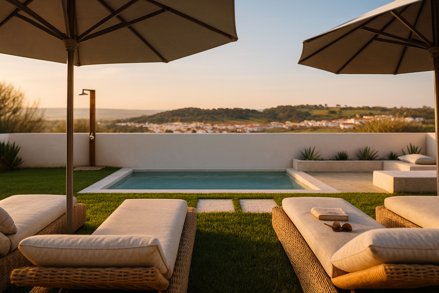 Hotel Boutique no Alentejo - construção em pedra tradicional, pérgolas em madeira e quartos de luxo.