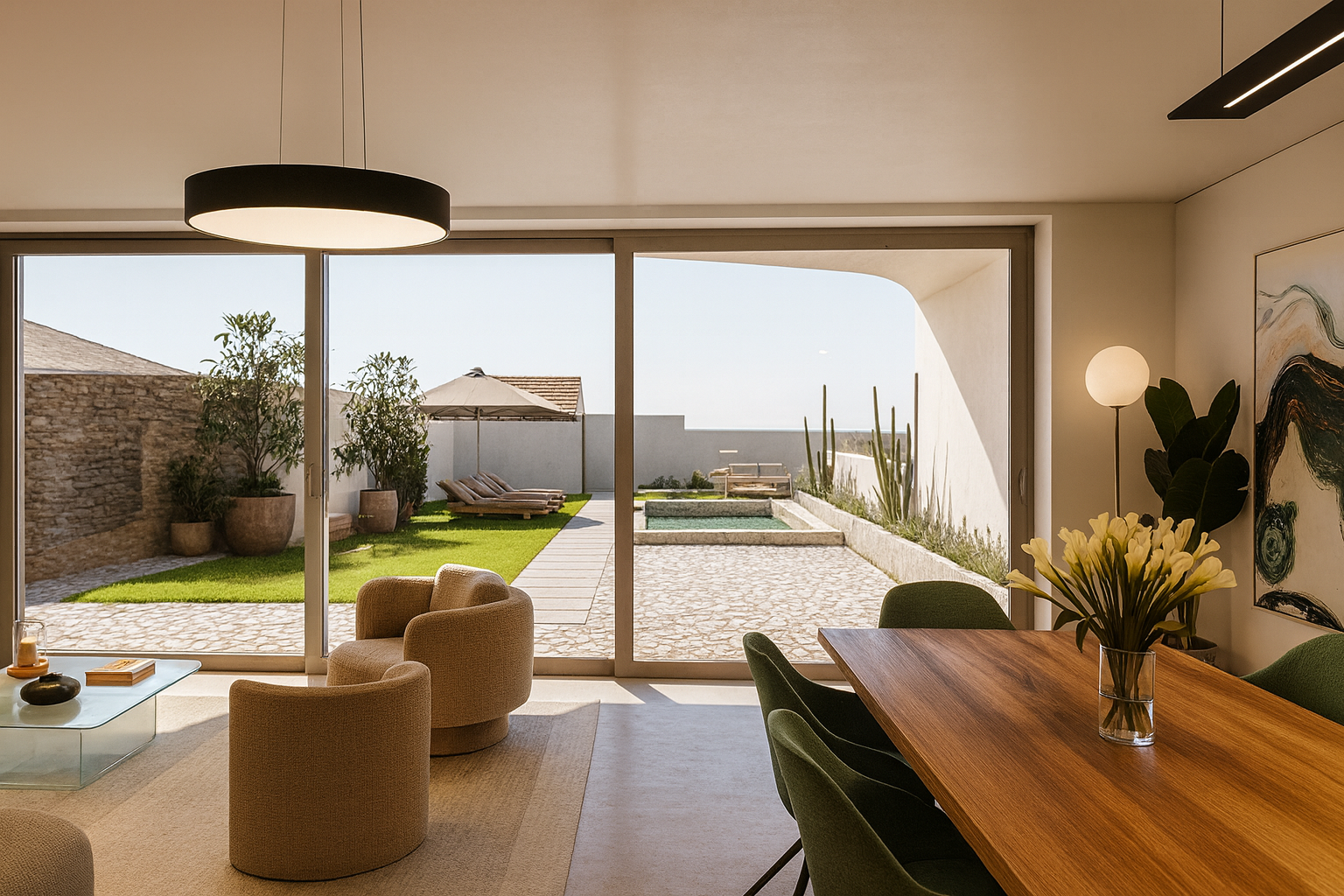 Condomínio residencial no Guincho com piscina orgânica, moradias modernas e interiores contemporâneos.