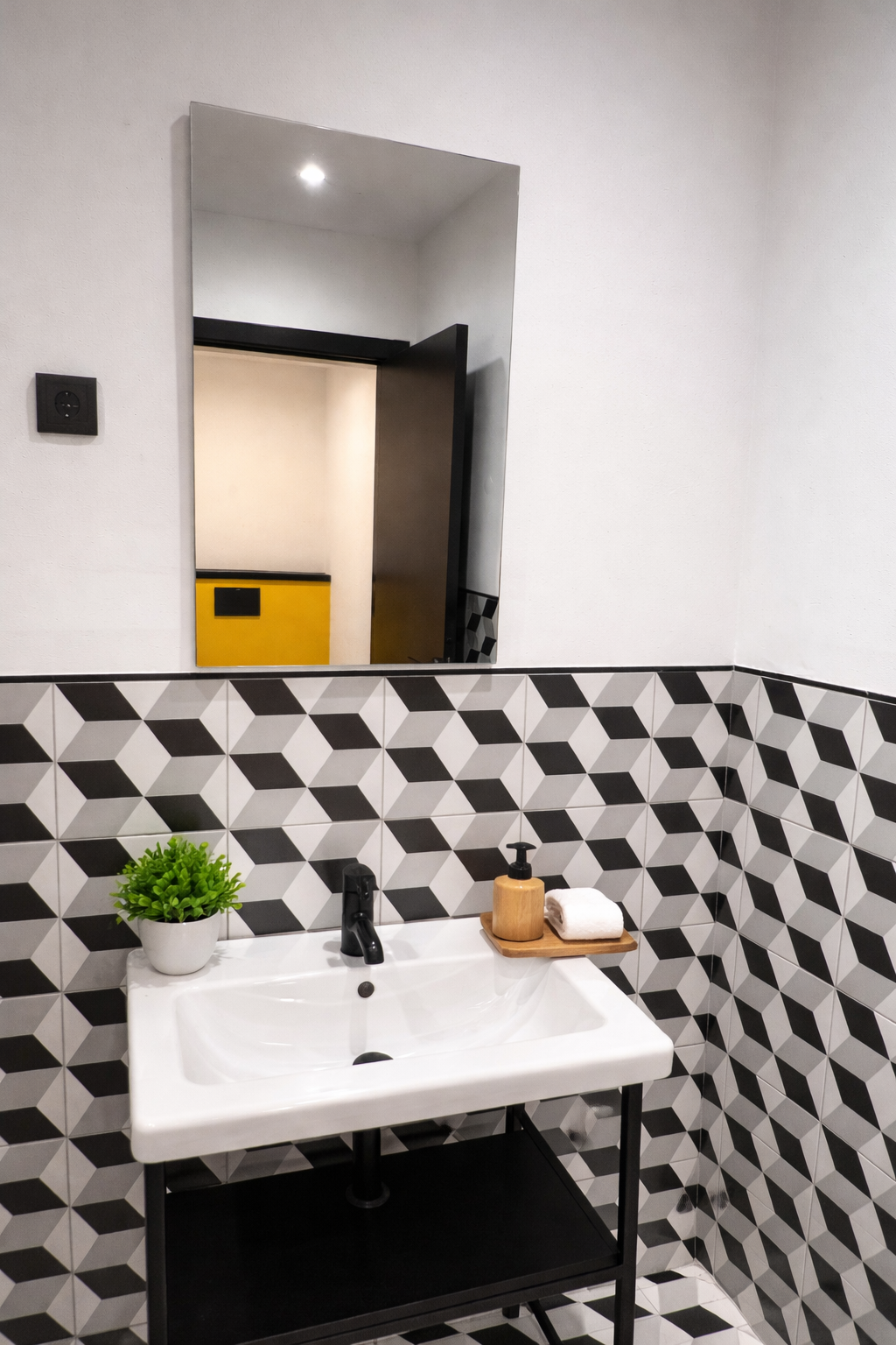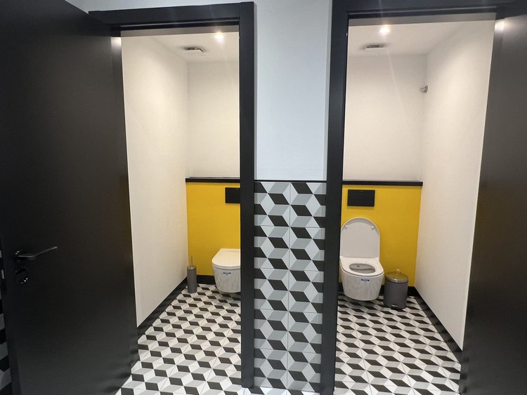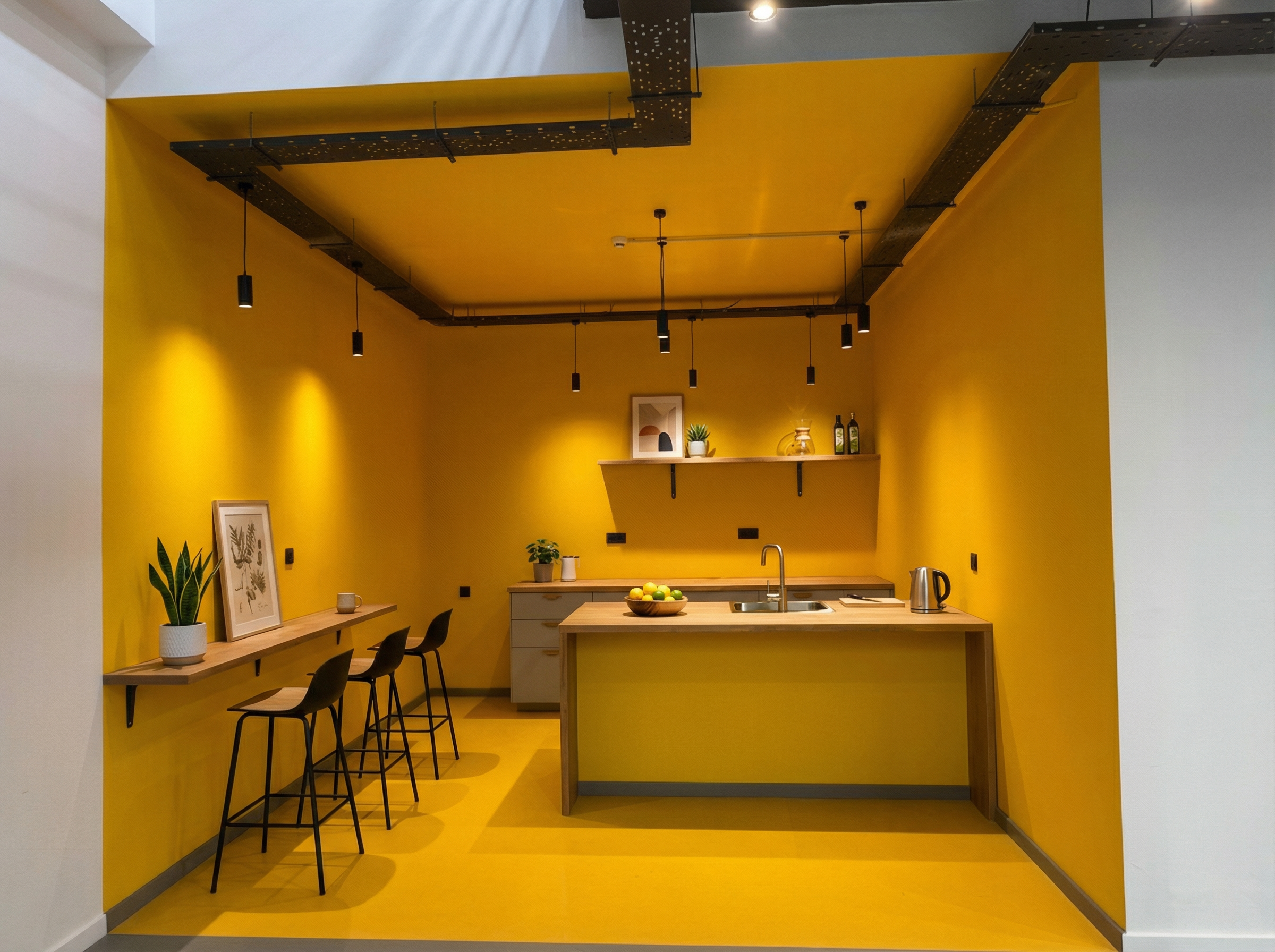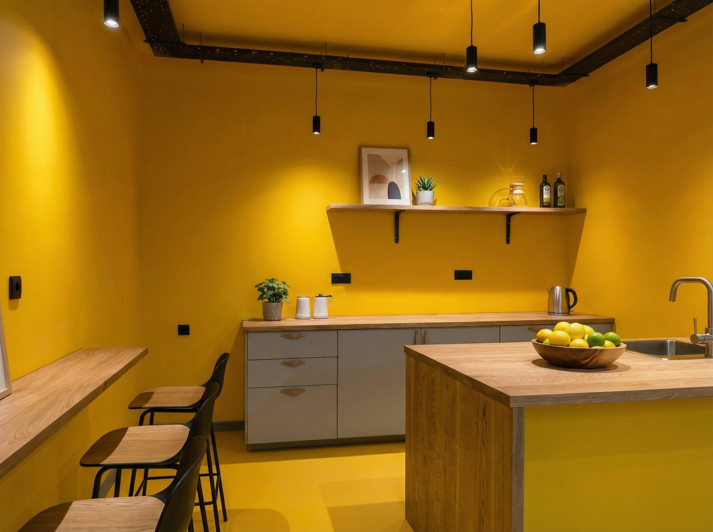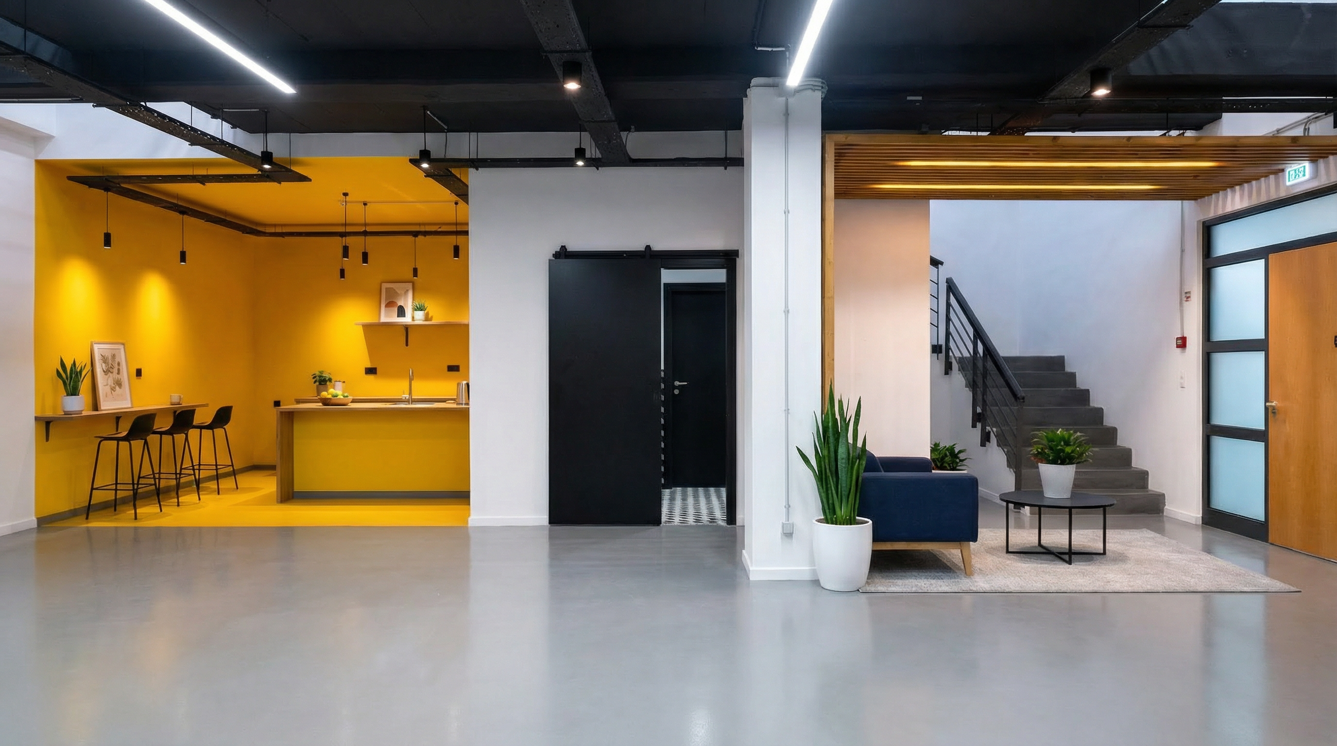 Projeto de design de interiores para a transformação de um espaço de escritórios de 300m² em Sintra. O conceito adoptou uma paleta cromática ousada, com paredes em amarelo vibrante que energizam o espaço e contrastam com elementos estruturais pintados de preto. A zona de copa e convívio apresenta mobiliário integrado em tons de amarelo e preto, criando um ponto focal marcante. Os pavimentos combinam madeira natural nas áreas de trabalho com mosaico geométrico em preto e branco nas zonas de circulação. O projeto incluiu o desenho de mobiliário personalizado, seleção de materiais e acompanhamento da execução, resultando num escritório com identidade visual forte e memorável.