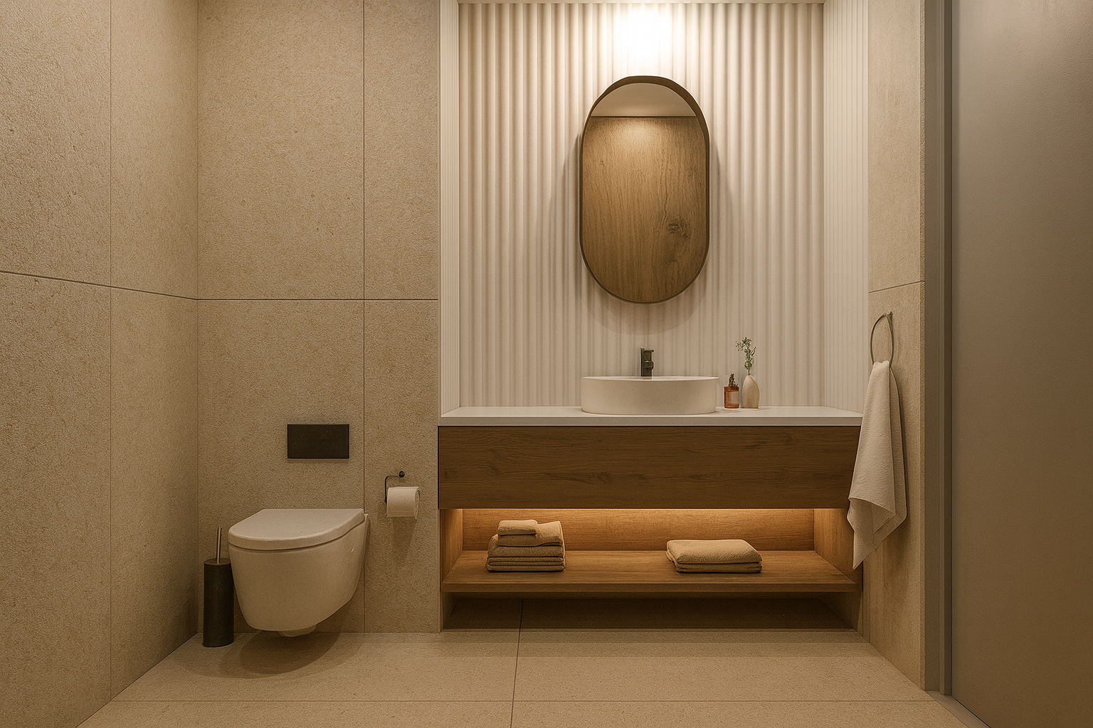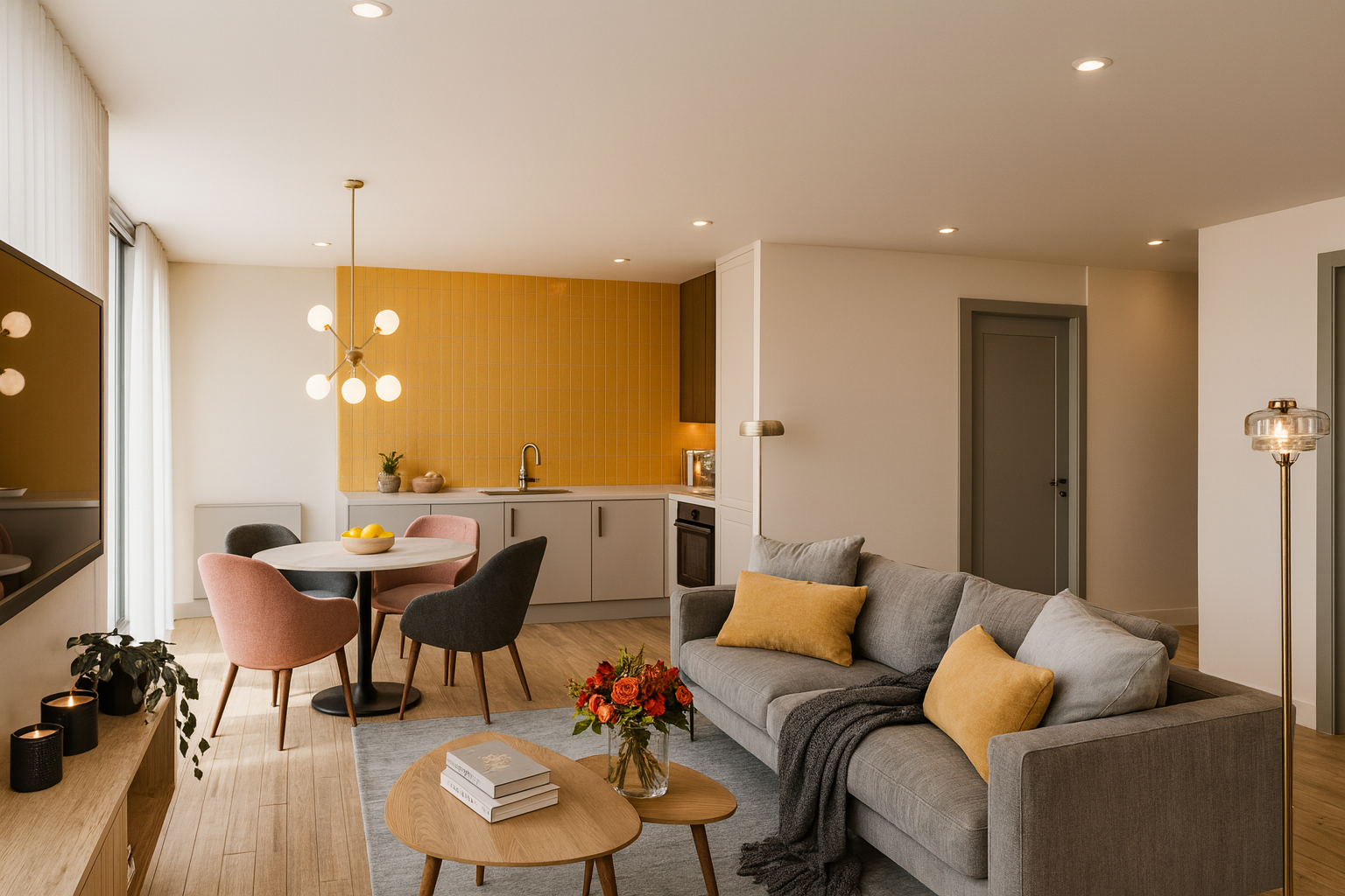 Projeto de design de interiores para apartamento de 77m² em Lisboa, optimizando o espaço através de soluções criativas com materiais naturais. A casa de banho apresenta revestimento integral em terrazzo cinza com bancada suspensa e espelho retroiluminado. Na zona social, uma parede de destaque em amarelo mostarda adiciona carácter e calor ao ambiente. O layout open-plan conecta sala, cozinha e zona de refeições, maximizando a sensação de amplitude num apartamento compacto.