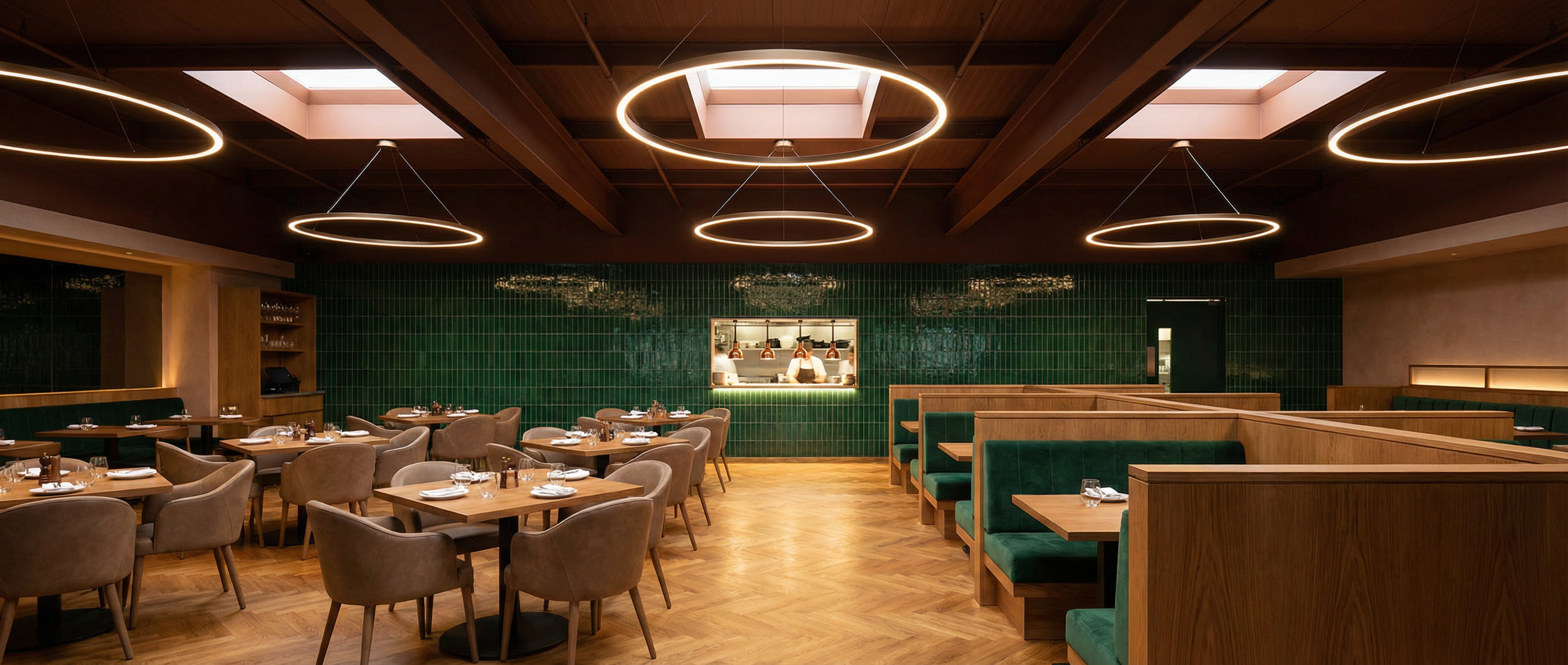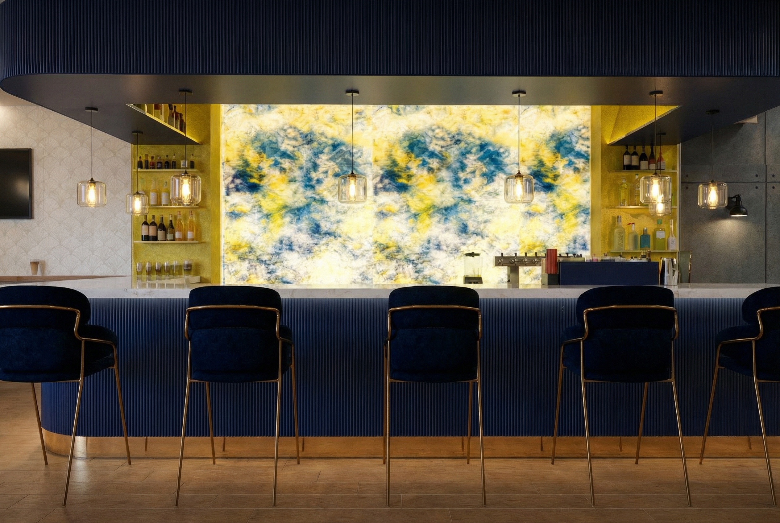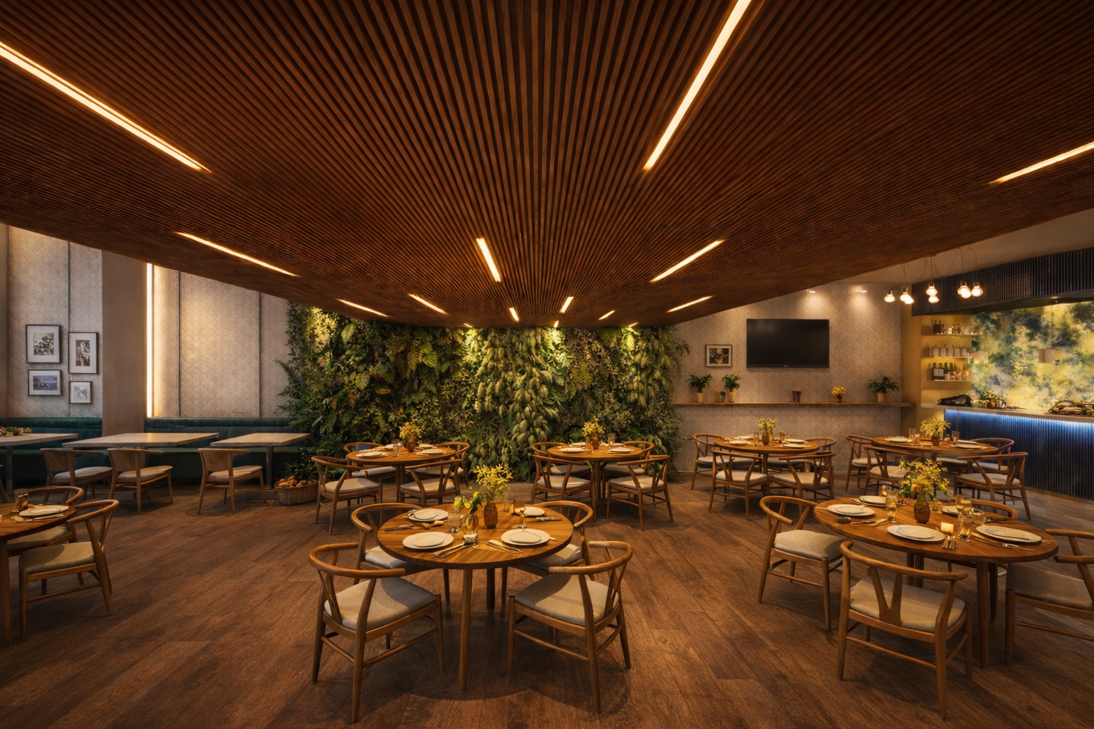 Design de interiores para cervejaria artesanal com 200 lugares - tetos escultóricos em madeira, bar em mármore e parede viva.